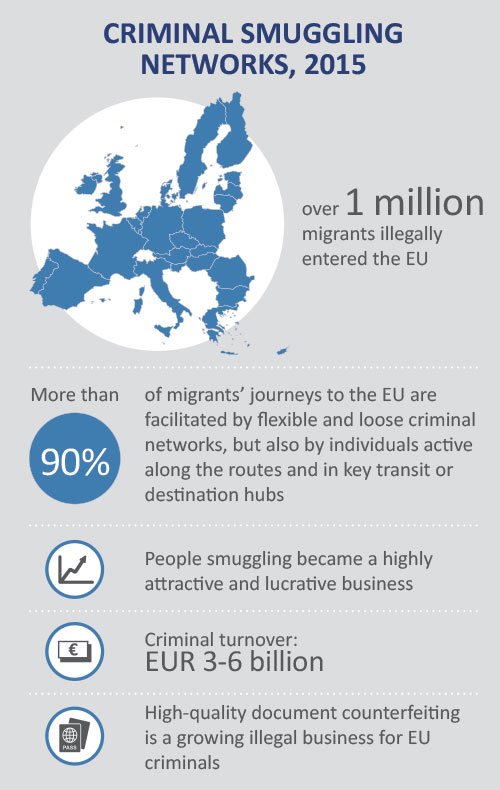 It is assessed that more than one million migrants entered the European Union illegally in 2015. Debriefings with the migrants at their points of entry suggest that 90% were brought into Europe by facilitators.