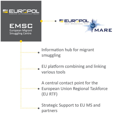 In view of this unprecedented crisis, and responding to the needs expressed by the European Union Member States, Europol restructured and reinforced its capabilities, specifically strengthening the role of its dedicated analysis project (focal point) and the joint operational team (JOT) Mare dealing with the facilitation of illegal migration. The goal has been to improve the sharing and exchange of information aimed at targeting and disrupting people smuggling networks. Europol has also put a lot of resources to aid ongoing operational activities, including the deployment of its officers and databases in the so-called hot spots.