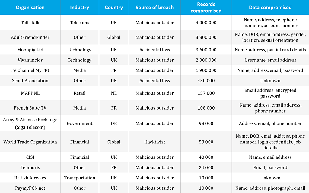 Nevertheless 2015 has already witnessed a number of significant data breaches. In May and July respectively, adult hookup websites AdultFriendFinder and AshleyMadison3, an allegedly discreet website for those seeking extra-marital affairs, were hacked. Both leaked personal and sensitive details related to millions of their customers, leaving them vulnerable to extortion and social engineering attacks. AshleyMadison's clientele were largely North American, however AdultFriendFinder had approximately 3.5 million customers worldwide. The proportion of these within Europe is unknown, therefore the impact of these breaches on European citizens may never be fully appreciated. However over 1400 customers were identified as senior executives of Fortune 500 companies4, over one fifth of which are based within Europe. It is therefore safe to assume that European citizens feature amongst those who have had their personal details disclosed.