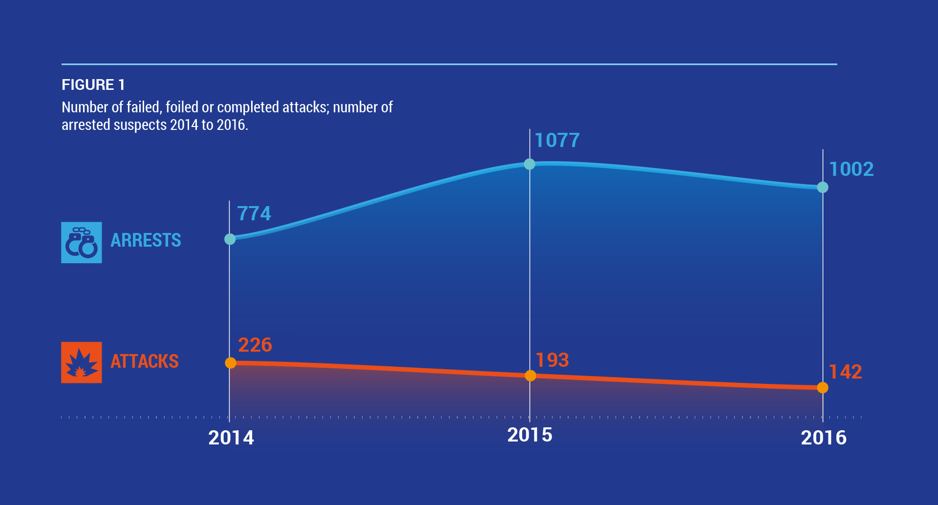 The number of arrests for terrorist offences in 2016 (1002) is lower than that of 2015 (1077). Most arrests were related to jihadist terrorism, for which the numbers rose for the third consecutive year: 395 in 2014, 687 in 2015 and 718 in 2016. Numbers of arrests for left-wing and separatist terrorist offences dropped to half of what they were in 2015 (from 67 and 168 in 2015 to 31 and 84 in 2016 respectively). Numbers of arrests for rightwing terrorism remained low at 12 in 2016 compared to 11 in 2015.