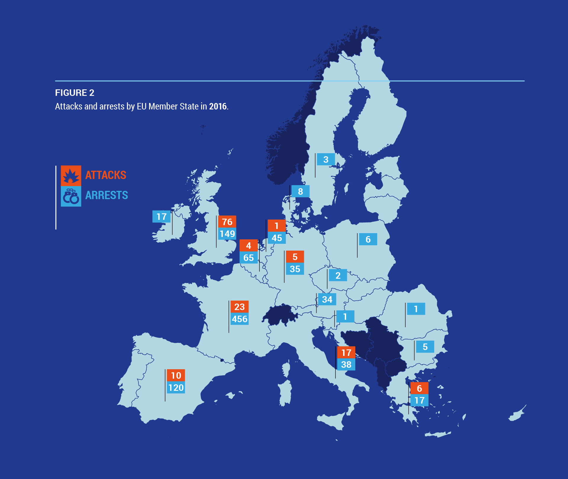 In 2016 a total of 142 failed, foiled and completed attacks were reported by eight Member States. More than half (76) of them were by the UK . France reported 23 attacks, Italy 17, Spain 10, Greece 6, Germany 5, Belgium 4 and Netherlands 1. Of the 142 attacks, less than half (47) were completed. Member States reported that 142 victims died as a result of terrorist attacks and 379 people were injured. Nearly all reported fatalities and most of the casualties were the result of jihadist terrorist attacks. The total number of 142 attacks is a continuation of a downward trend that started in 2014 when there were 226 attacks, followed by 211 in 2015. The largest number of attacks in which the terrorist affiliation could be identified were carried out by ethno-nationalist and separatist extremists (99). Attacks carried out by left-wing violent extremists have been on the rise since 2014; they reached a total of 27 in 2016, of which most (16) were reported by Italy. The number of jihadist terrorist attacks decreased from 17 in 2015 to 13 in 2016, of which 6 were linked to the so-called Islamic State (IS). However, a precise ranking amongst and within terrorist affiliations across the EU cannot be established because the UK does not provide disaggregated data on attacks.