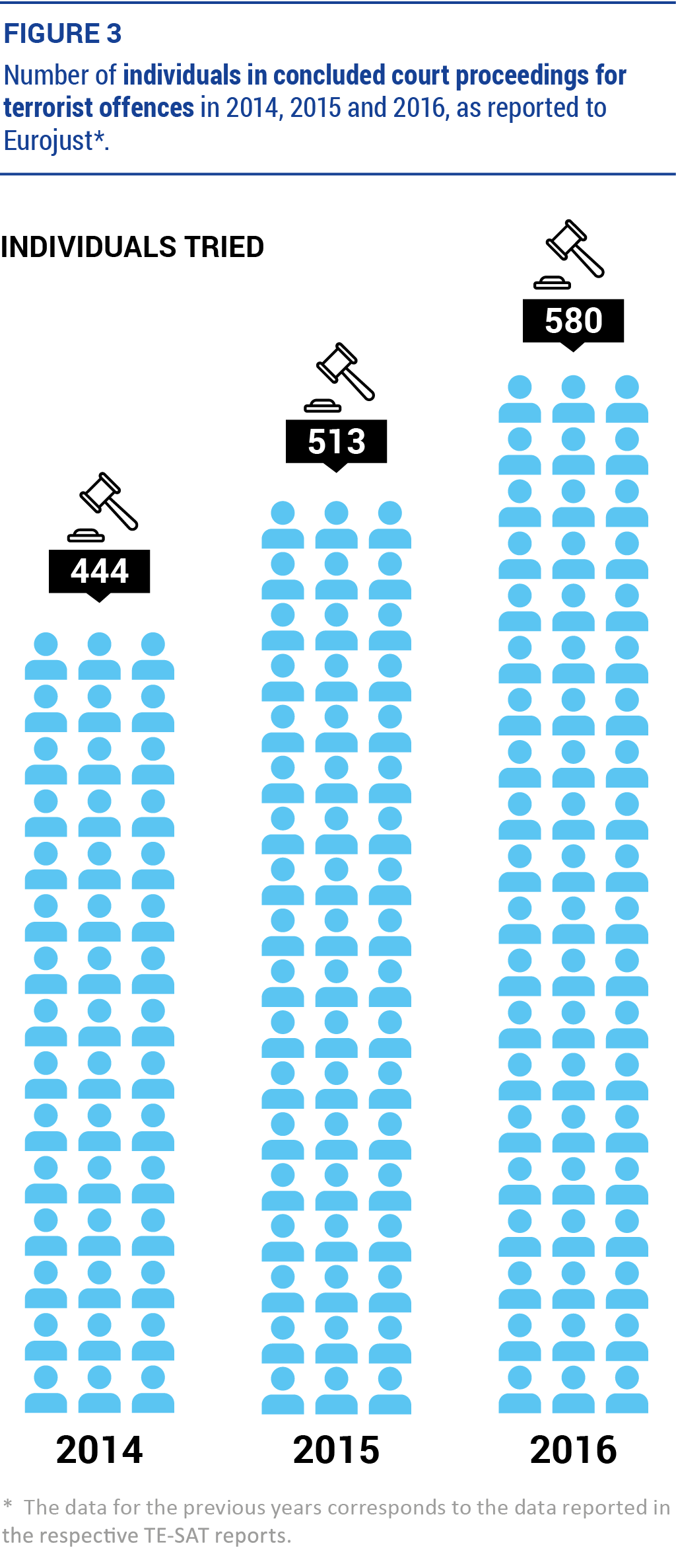 Eurojust considers it one verdict if an individual is convicted of more than one terrorist offence within the same proceeding, or convicted of a terrorist offence and acquitted of another offence. If an individual is acquitted of a terrorist offence and convicted of another offence, the verdict is included in the overview as acquittal of terrorism.