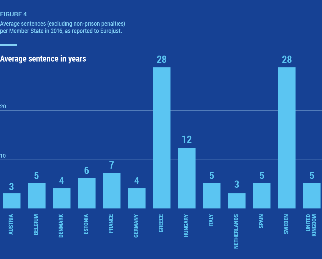 Similar to 2015, in 2016 the average prison sentence for left-wing terrorist offences was the highest, increasing from 12 to 28 years. Jihadist and separatist terrorist offences were punished with an average prison sentence of 5 years, and right-wing terrorist offences with 4 years .