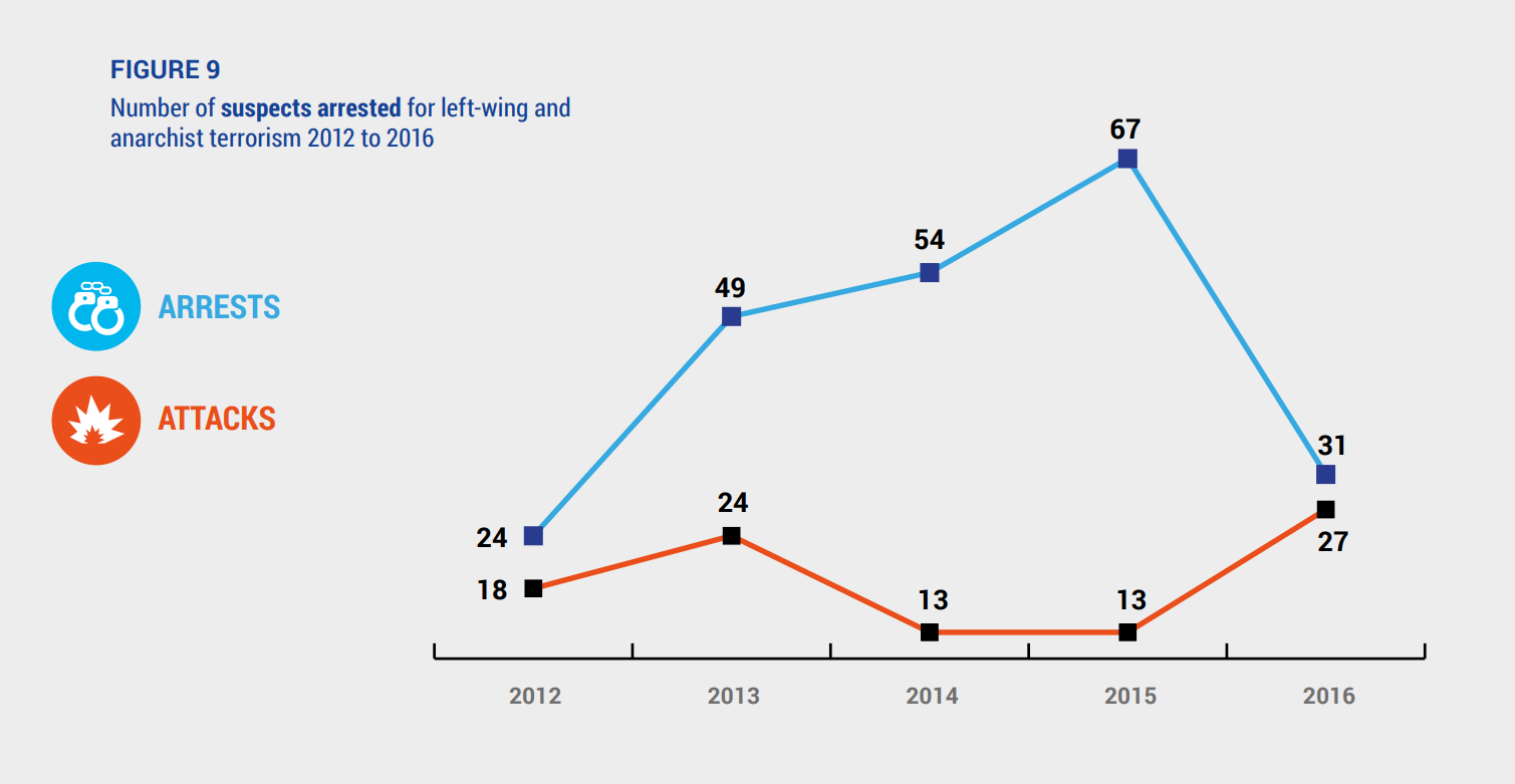 In 2016, left-wing and anarchist terrorist groups or individuals in the EU carried out 27 attacks. This was a sharp increase, compared to the number of attacks that occurred in 2015. EU Member State authorities arrested 31 people related to left-wing and anarchist terrorism in 2016, most of them in Spain.