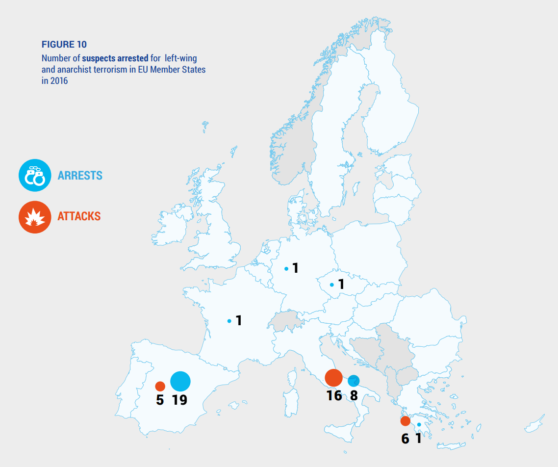 Italy, Greece and Spain were again the only EU Member States to experience left-wing and anarchist terrorist attacks. Over the past two decades, anarchist terrorist groups in these three countries have developed similar characteristics, used the same modi operandi and endorsed similar agendas. In 2016, there were no coordinated terrorist campaigns across the three countries. However, it is assessed that some attacks in Italy were carried out in response to a call for action by imprisoned anarchist terrorists in Greece.